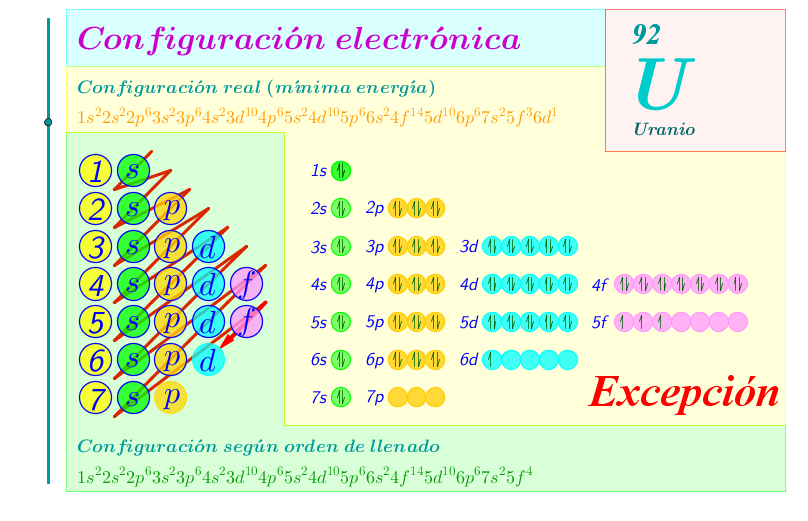 La configuración electrónica de un átomo de un elemento químico (de número atómico Z), se puede construir a partir del anterior (número atómico Z-1), añadiendo un electrón (electrón diferenciador). Para ello se van añadiendo electrones siguiendo el orden energético (1), respetando el principio de exclusión de Pauli (2) y verificando la regla de máxima multiplicidad de Hund (3).