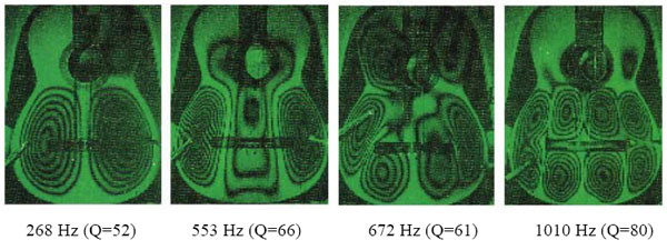 La resonancia tiene gran relevancia en nuestra experiencia cotidiana. Un niño columpiándose, un instrumento musical resonando, nuestro aparato de radio sintonizando una emisora, son sólo algunos ejemplos de los beneficios que nos puede reportar. Aquí debajo podemos observar los modos de vibración de una guitarra. Los objetos extensos tienen más de una frecuencia de resonancia. |