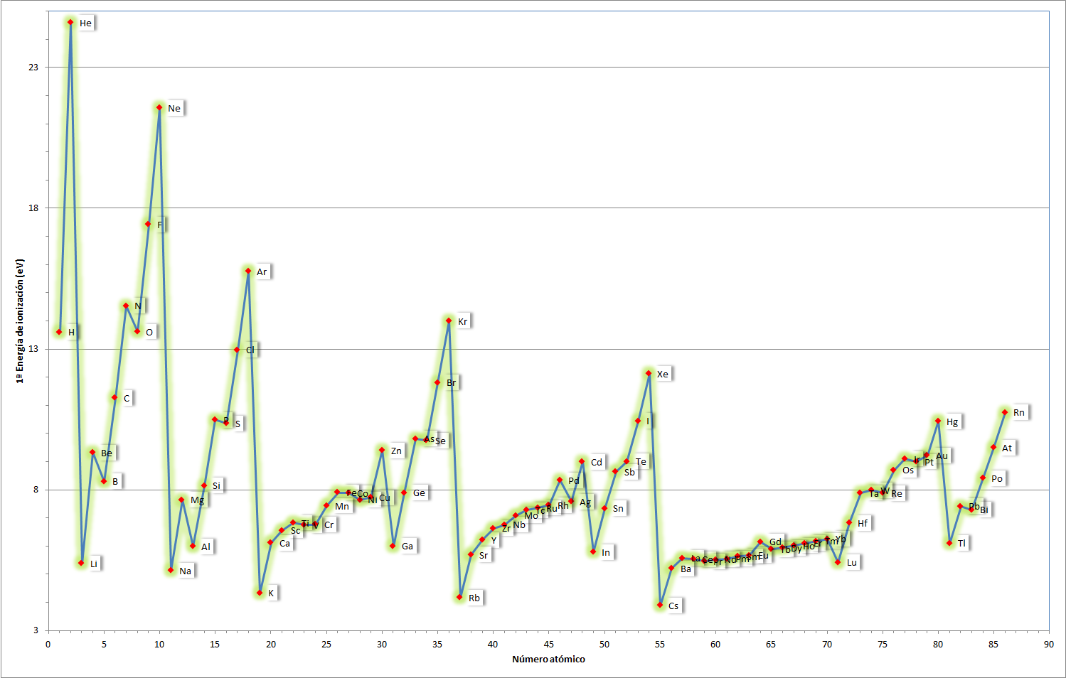 Y así sucesivamente. Estas energías cada vez son mayores ya que a medida que desaparecen los electrones hay un exceso de carga positiva y un menor apantallamiento que ejerce más fuerza sobre los electrones restantes. Si el electrón retirado es de una capa inferior, la energía de ionización correspondiente será mucho mayor debido a la mayor proximidad del electrón al núcleo, según la ley de Coulomb.