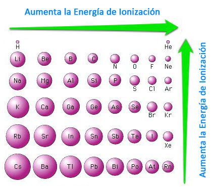 La estabilidad de los electrones externos de los átomos se refleja de manera directa en la energía de ionización o potencial de ionización, propiedad periódica que puede definirse como la energía mínima necesaria para arrancar el electrón menos ligado de un átomo gaseoso en su estado fundamental, transformándolo en un ion positivo. Es una propiedad atómica y se puede expresar en eV por átomo (de ahí potencial de ionización) o referida a un mol de átomos en kJ/mol. Se representa por I1. El proceso se puede representar como: