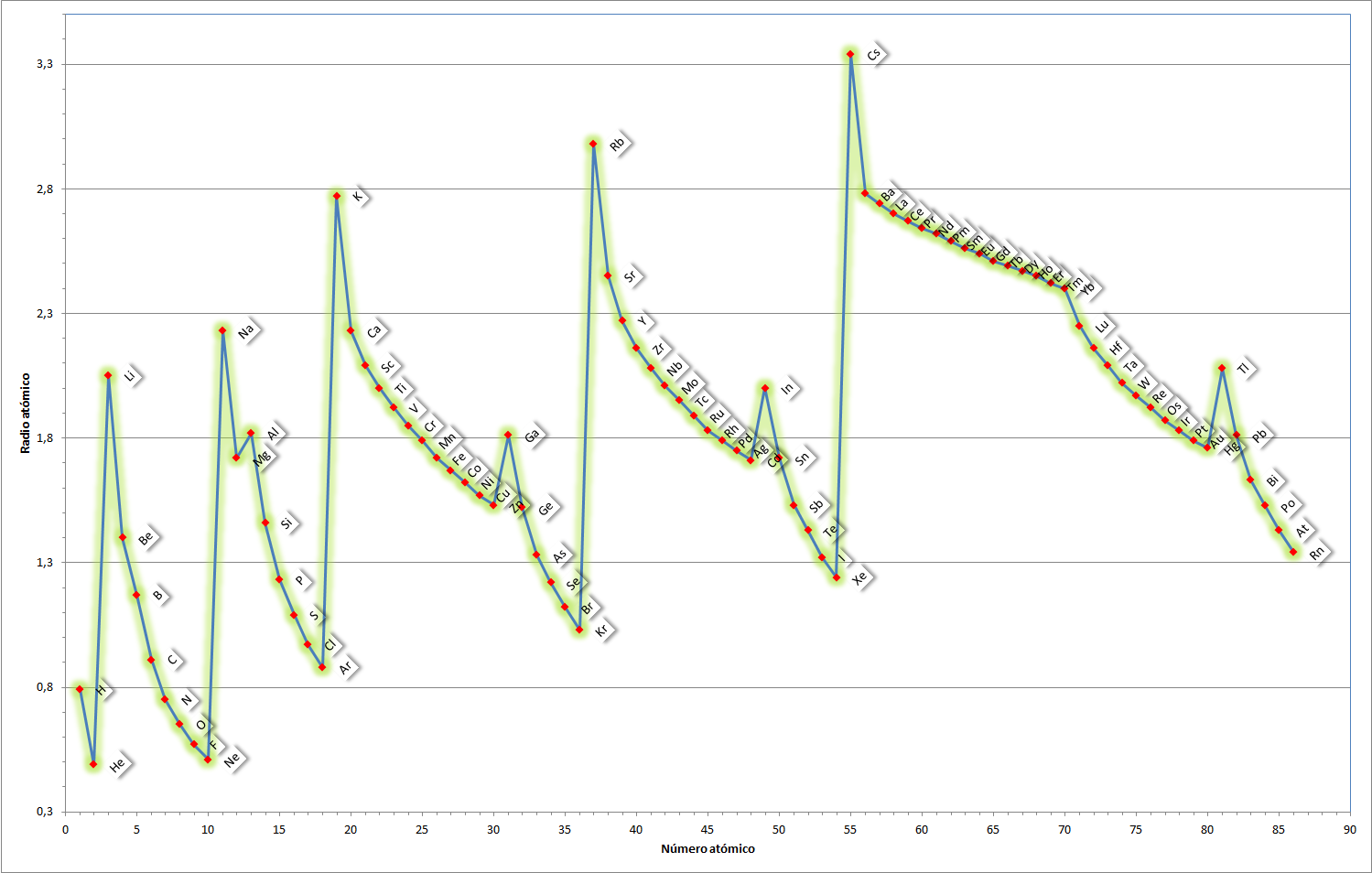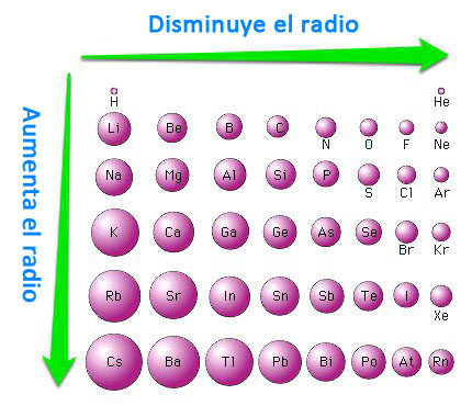 Analizando la tabla anterior se observa que en un grupo el radio atómico crece al aumentar el número atómico (descender en un grupo), esto se debe a que al aumentar el número de capas los electrones externos se encuentran más alejados del núcleo. También observamos que en un periodo disminuye al aumentar el número atómico (desplazarnos hacia la derecha), esto se debe al aumento de la carga del núcleo que, puesto que no hay cambio de capa e incluso con el mayor apantallamiento debido al mayor número de electrones, hace que la fuerza de atracción hacia los electrones externos aumente y, por lo tanto, disminuya el radio atómico.