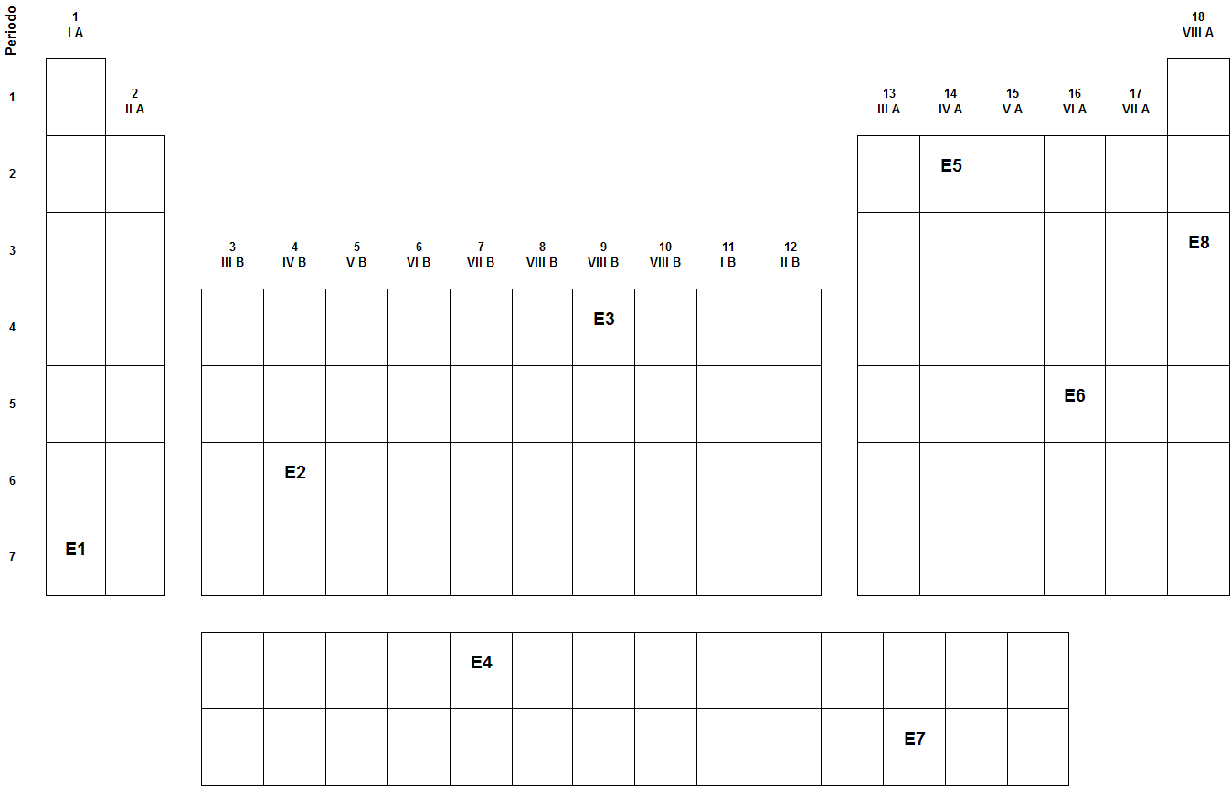 En la tabla representamos ciertos elementos numerados de E1 a E8. Halla su número atómico, su configuración electrónica y el nombre del elemento representado.