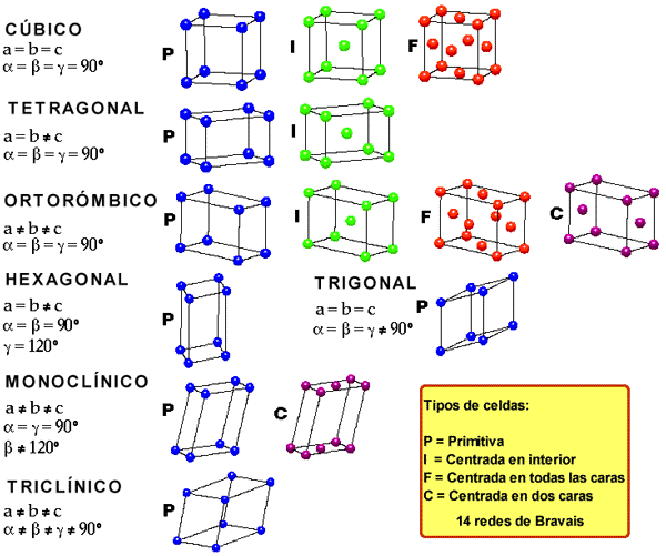 Hay siete sistemas cristalográficos en función del tipo de poliedro en el que pueden colocarse los iones. Según si estos ocupan los vértices, los centros de las caras o el centro del cuerpo de dichos poliedros se desdoblan en catorce disposiciones conocidas como redes de Bravais. El más sencillo de los poliedros que se pueden formar con un retículo cristalino recibe el nombre de celdilla unidad.