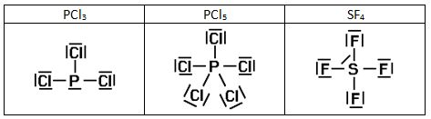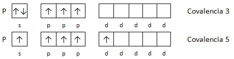 • Octeto expandido. A partir del tercer del tercer período, algunos elementos (al tener orbitales d), pueden rodearse de más de ocho electrones; por ejemplo, en el PCl5 el fósforo está unido con cinco átomos de cloro, así que tendrá diez electrones a su alrededor.