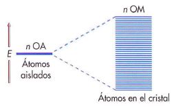 El orbital 2s de un átomo de litio, con un único electrón, puede solaparse con los orbitales 2s de todos los átomos de litio que le rodean para producir un conjunto de orbitales deslocalizados que se extienden de forma continua por todos los átomos de la red cristalina.