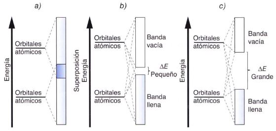 En el caso de metales con el orbital s lleno, la banda de valencia también lo estará, pero la banda superior formada por los orbitales p vacíos, llamada banda de conducción, aparece con energía similar, por lo que se solapa con aquella creándose un gran espacio de libre movilidad electrónica a poca energía que se les comunique. (Apartado “a” de la figura)