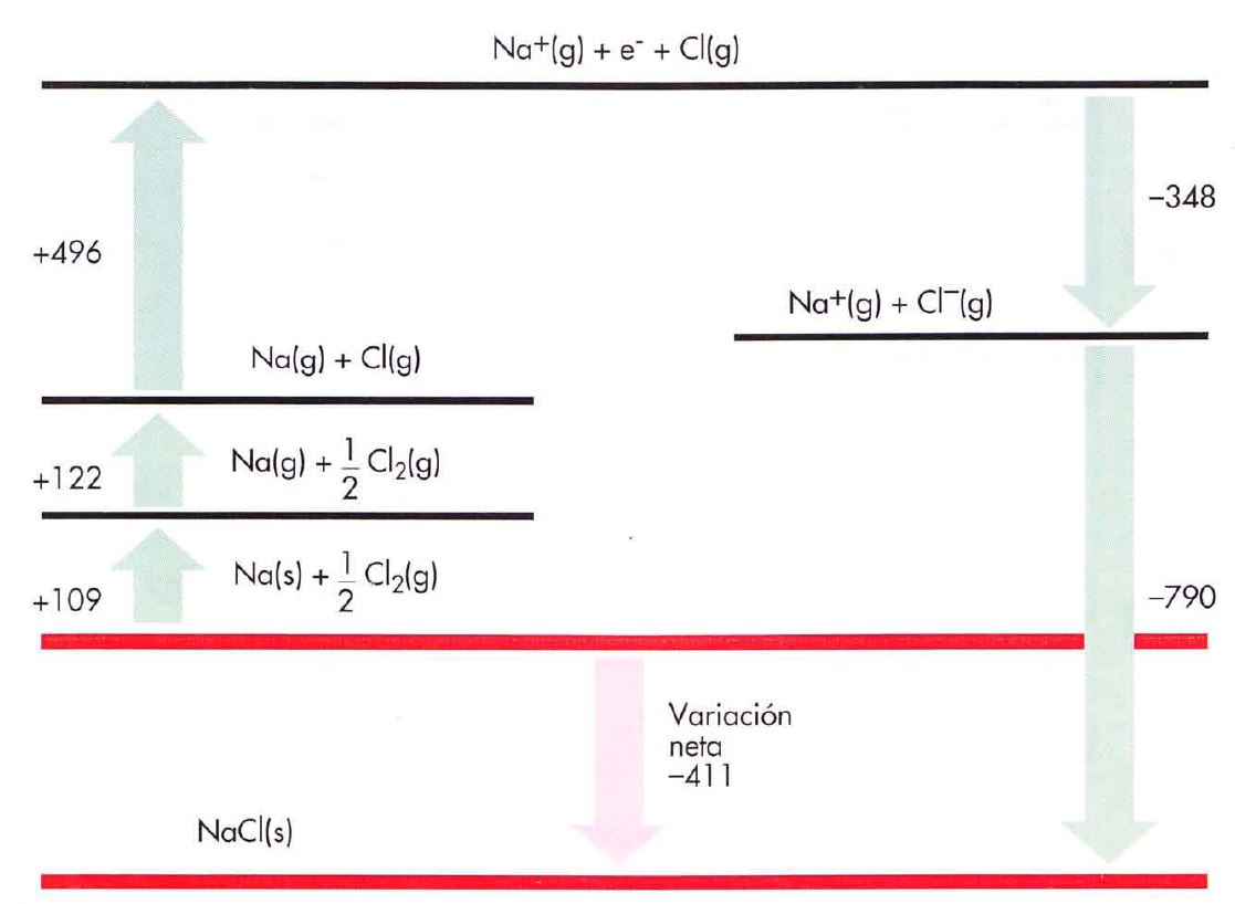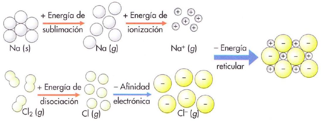 Tiene lugar a través de una serie de procesos parciales: Para que se formen los iones Na+ y Cl-, el metal habrá de separar sus átomos entre sí (sublimación), y luego cada átomo deberá perder un electrón (ionización); el no-metal, tendrá, primero, que romper la molécula (disociación) y, a continuación, cada átomo deberá perder un electrón (afinidad electrónica). Por fin los iones Na+ y CI-, se unen para formar la red cristalina. En este  proceso se liberará una energía exactamente igual a la energía reticular.