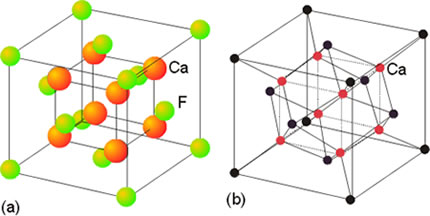 En el fluoruro de calcio (fluorita) CaF2 debe haber el doble de iones F- que de iones Ca2+. El índice de coordinación de Ca2+ y de F- ya no va a ser el mismo. El del Ca2+ debe ser el doble que el del F-. En este caso el l.C. del Ca2+ es 8 y el l.C. del F- es 4. Esta propiedad geométrica la cumple red cúbica centrada en las caras para el Ca2+ y tetraédrica para el F